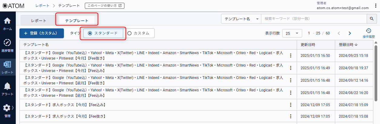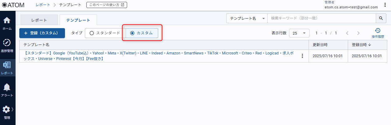 スタンダードテンプレートを複製したカスタムテンプレートが登録されていることを確認します。