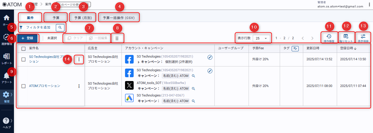 ATOM画面サイドバー[管理]の[案件]からアクセスできます。