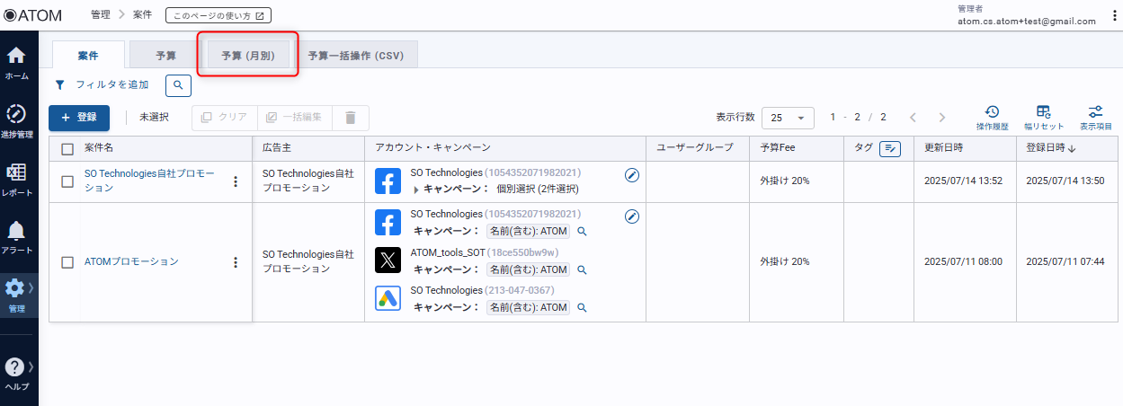 案件一覧画面の[予算(月別)]タブからアクセスします。