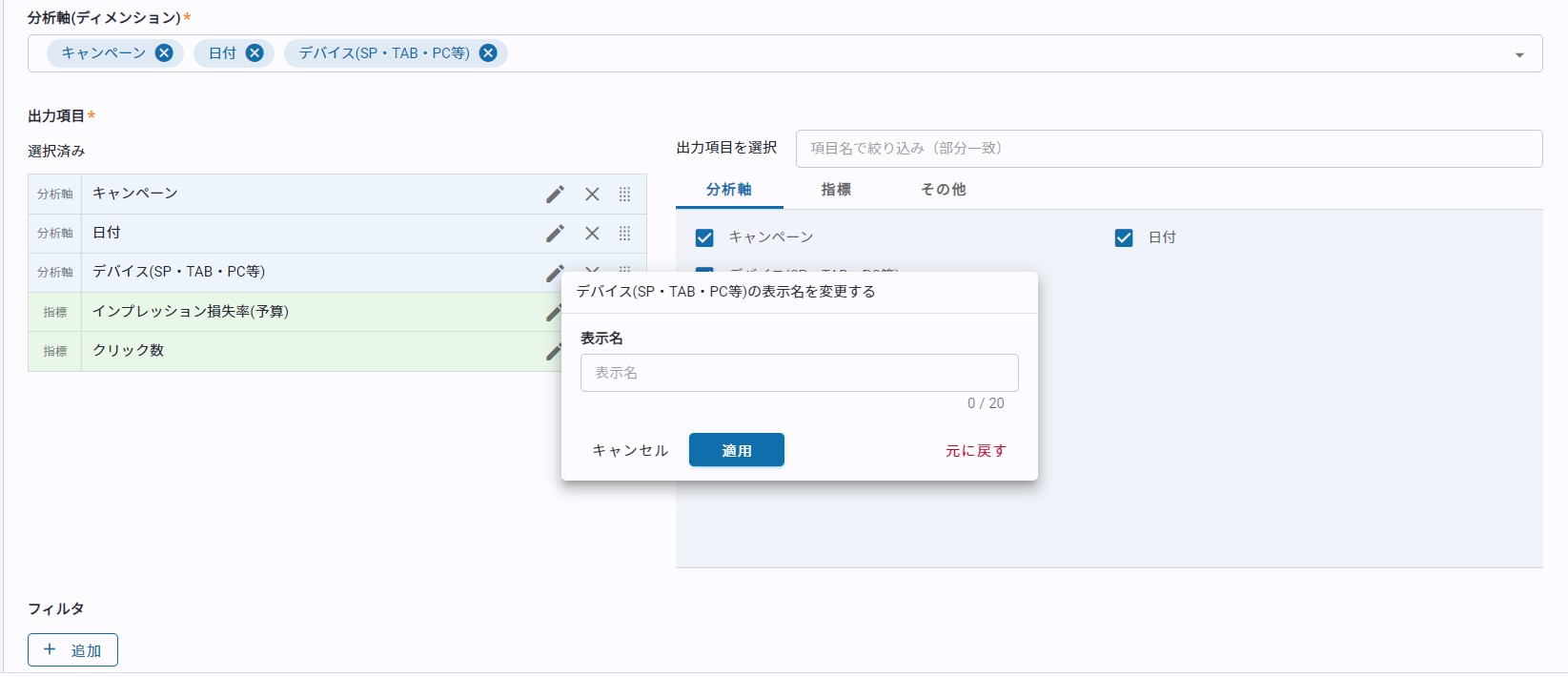 変更後は「元に戻す」で元の指標名・分析軸名に戻すことができます。