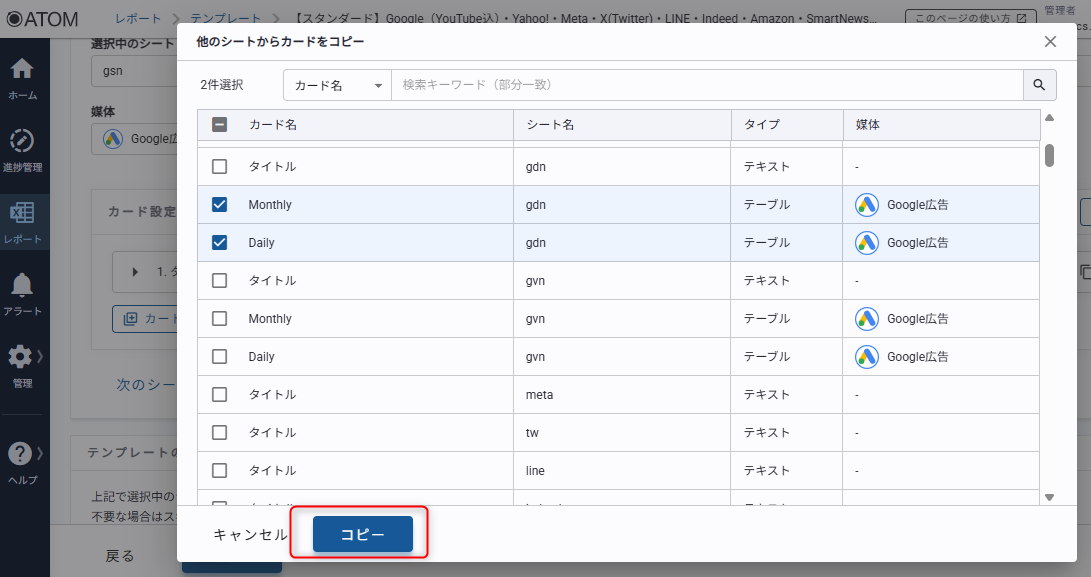 3. 複製したいカードを選択して[コピー]をクリックする