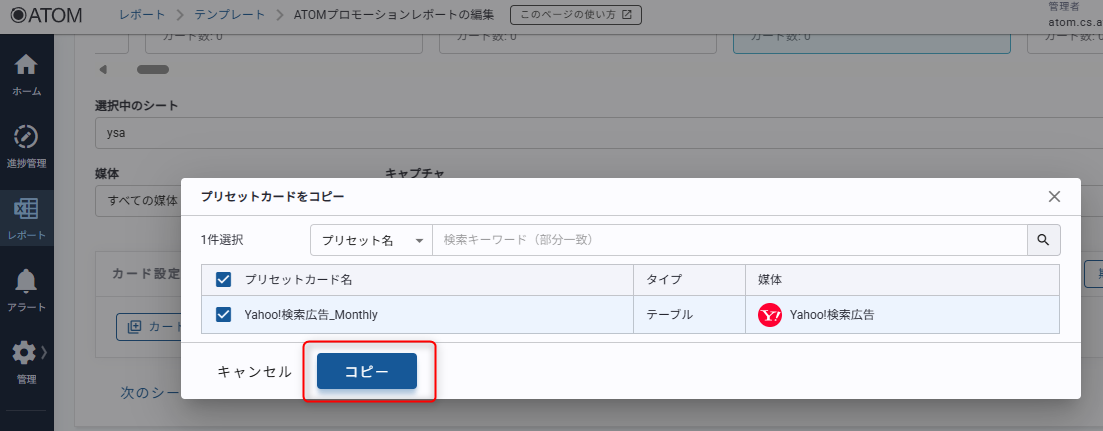 3. 追加したいプリセットカードを選択して[コピー]をクリックする