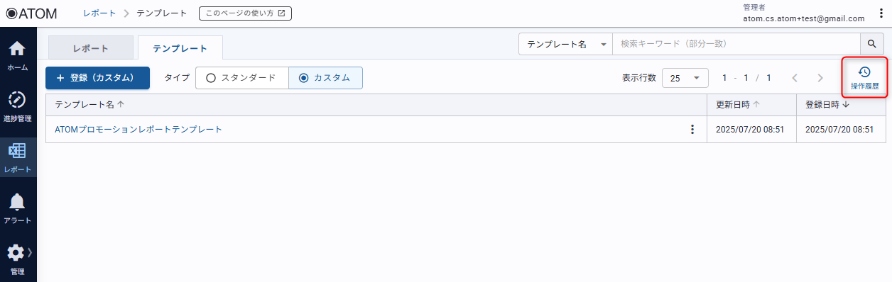 1. カスタムテンプレート一覧画面内、[操作履歴]をクリックする