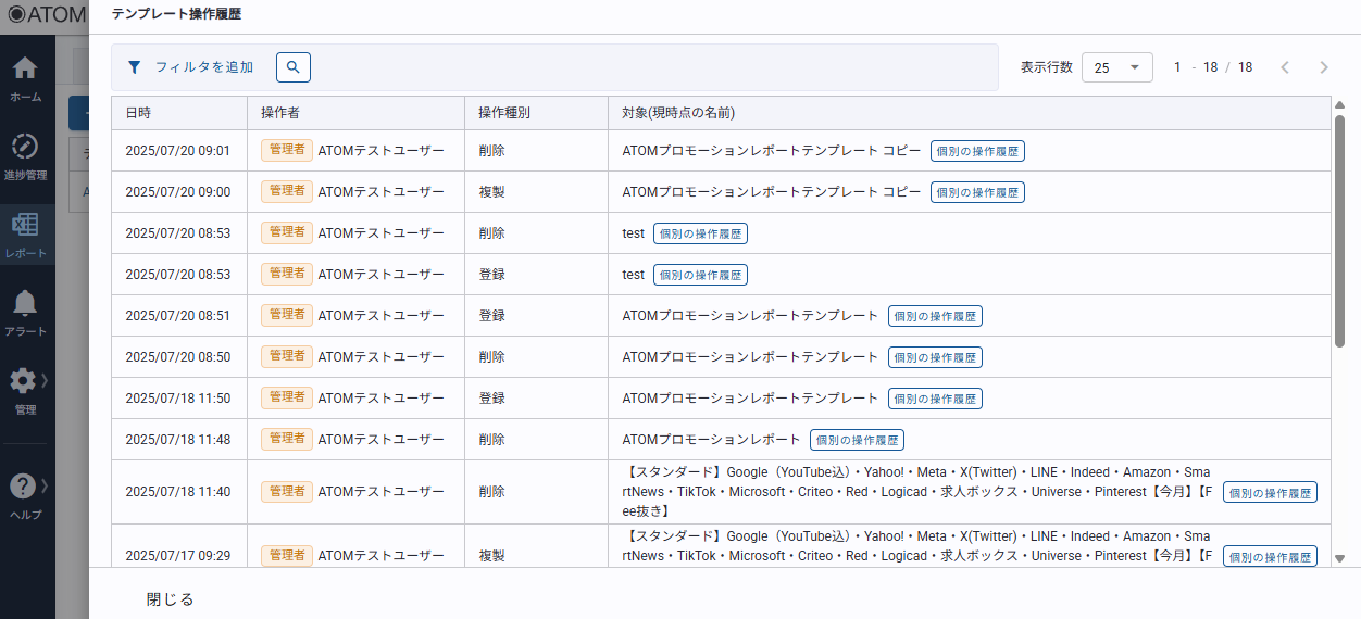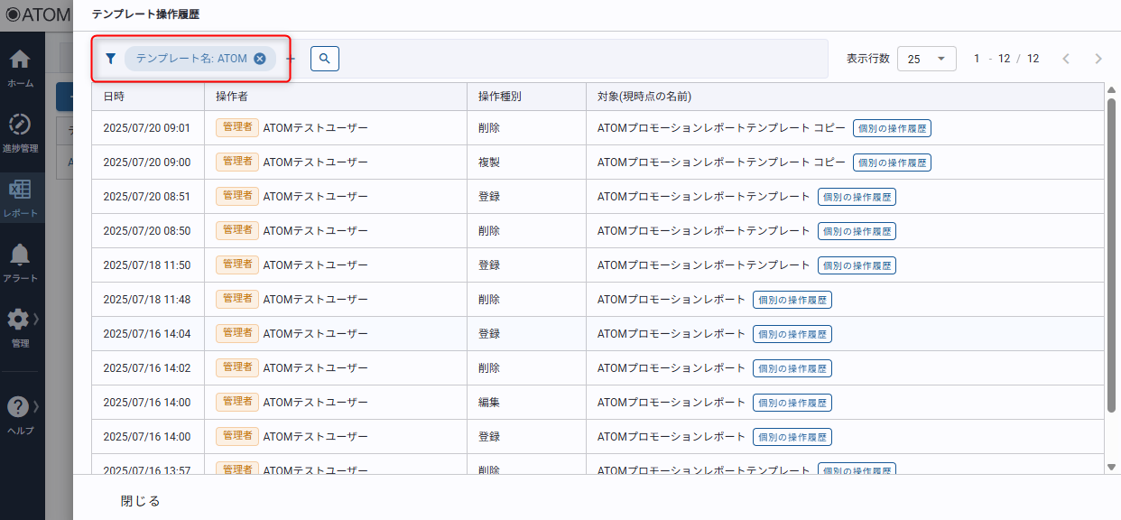 すべてのカスタムテンプレートに対する操作履歴が表示されます。