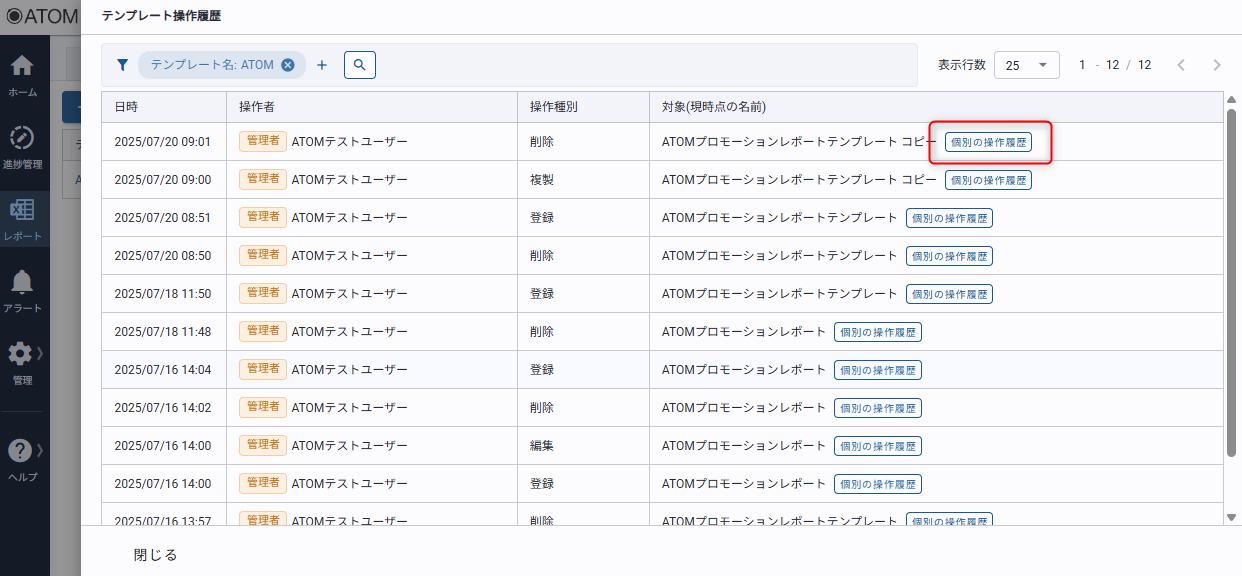 2. 操作履歴を確認したいレポートの[個別の操作履歴]をクリックする