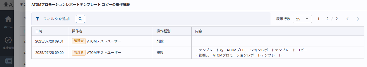 対象のカスタムテンプレートに対する操作履歴が表示されます。