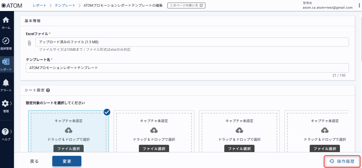 カスタムテンプレート編集画面の[操作履歴]からも個別の操作履歴を確認できます。