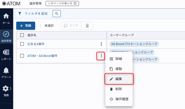 1. 進捗管理一覧画面内、編集したい進捗名の三点リーダから[編集]をクリックする
