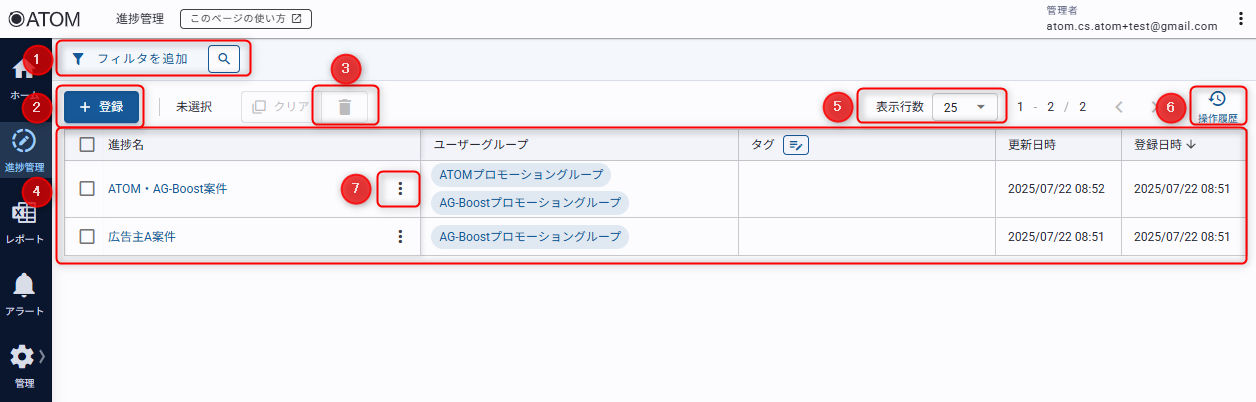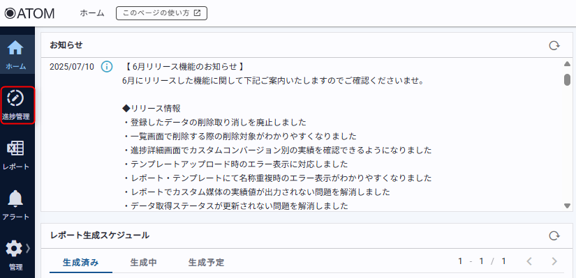 ATOM画面サイドバー[進捗管理]からアクセスできます。
