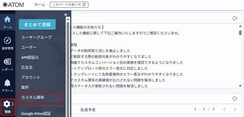 ATOM画面サイドバー[管理]の[カスタム媒体]からアクセスします。