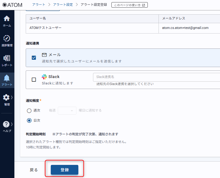 通知先のユーザーへの通知方法を設定します。 メール通知の送信元メールアドレスはno-reply@atom.onlです。 slack連携を設定する場合はあらかじめslack連携を行う必要があります。 |
