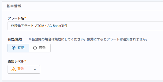| 有効/無効 | アラートのステータスを入力します。 無効を選択するとアラート通知が行われません。 |