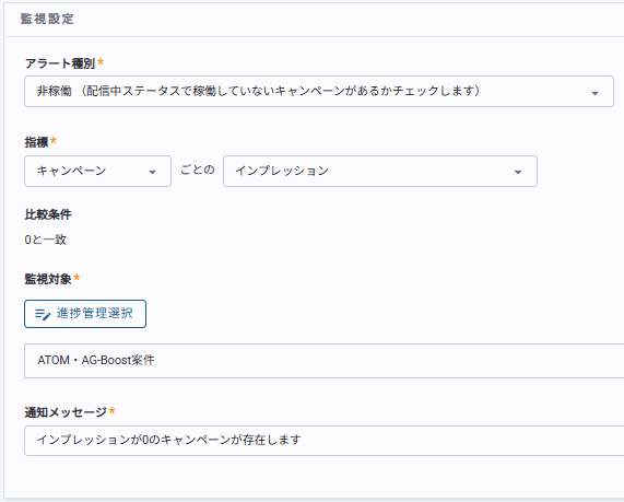 進捗管理にインプレッション数が0のキャンペーンがある場合に通知するアラートです。