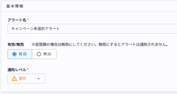 キャンペーン未選択アラートの基本情報の設定項目一覧
