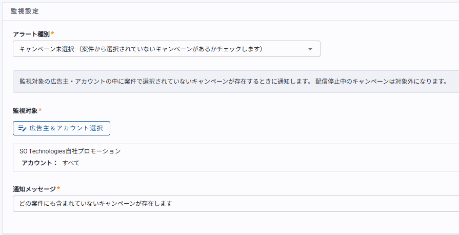 3. アラート種別にキャンペーン未選択アラートを選択して監視設定を入力する