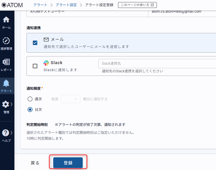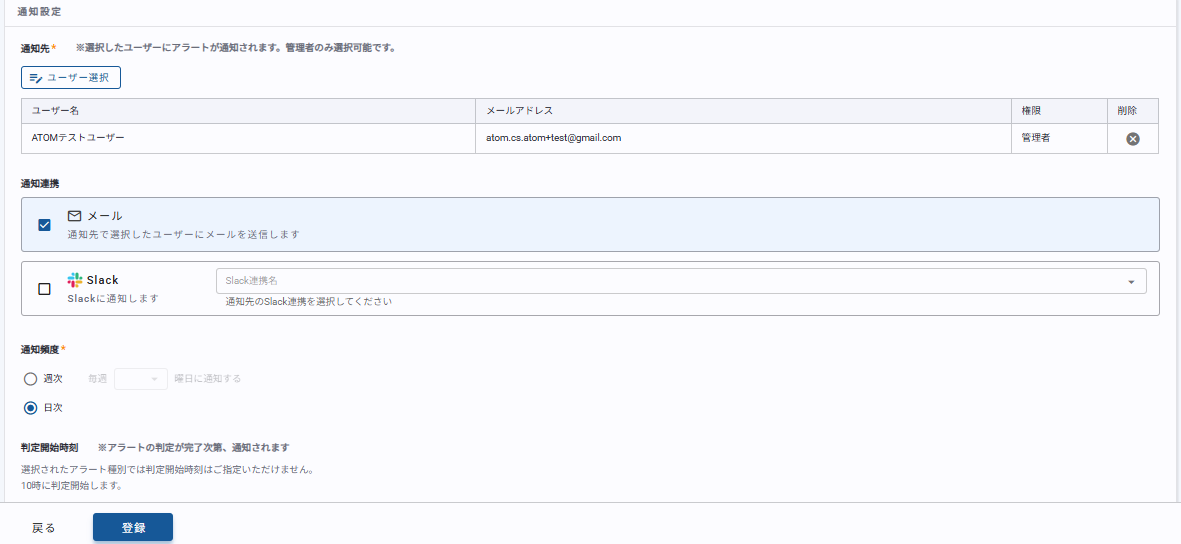 通知先のユーザーへの通知方法を設定します。 メール通知の送信元メールアドレスはno-reply@atom.onlです。 slack連携を設定する場合はあらかじめslack連携を行う必要があります。 |
