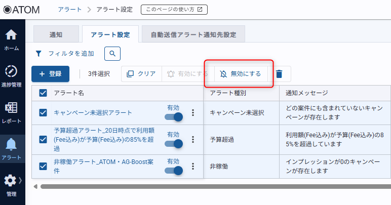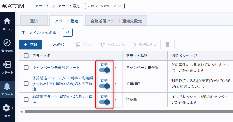 登録したアラートはアラート設定一覧画面で無効または有効にすることが可能です。