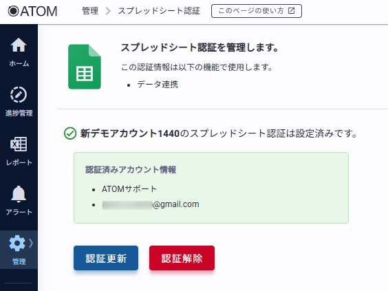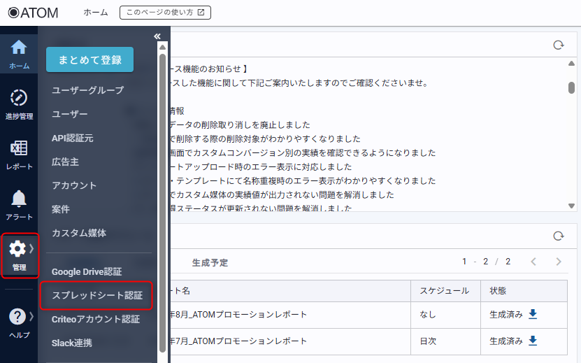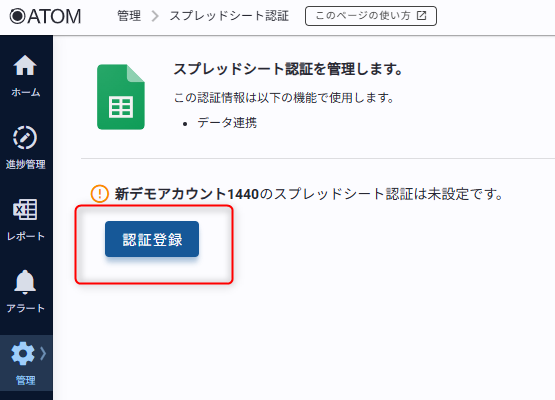 2. ATOM画面サイドバー[管理]の[スプレッドシート認証]をクリックする
