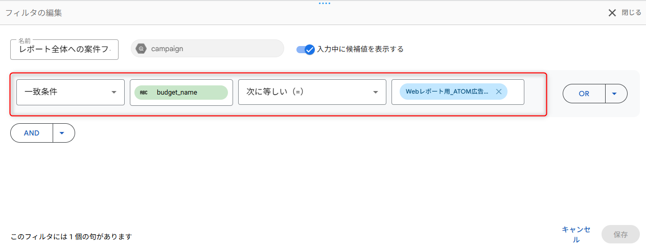 任意のフィルタ名を入力して、「一致条件」 「budget_name(またはbudget_id)」 「次に等しい(=)」を選択して、出力したいATOMに登録されている案件名または案件IDを入力して[保存]します。