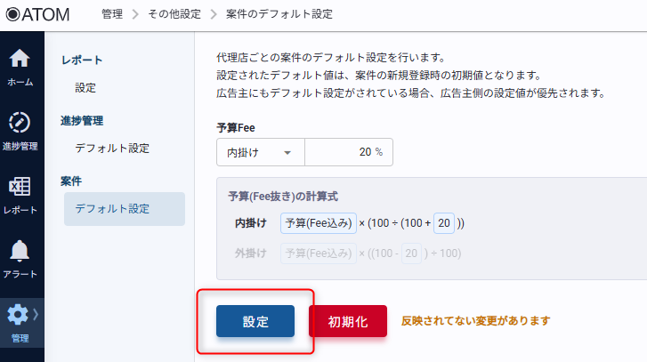 3. 案件のデフォルトとする予算Feeを入力して[設定]をクリックする
