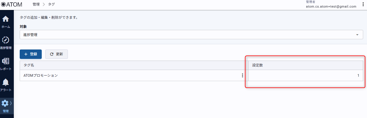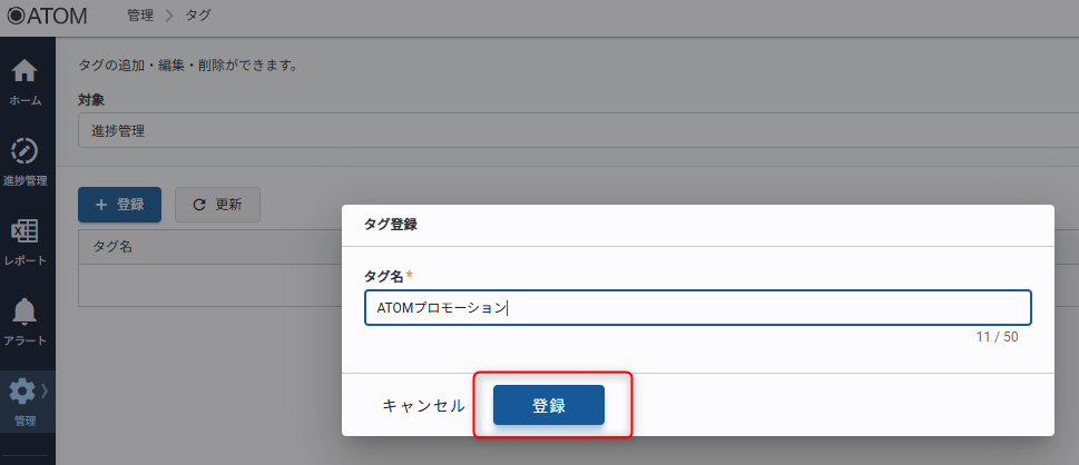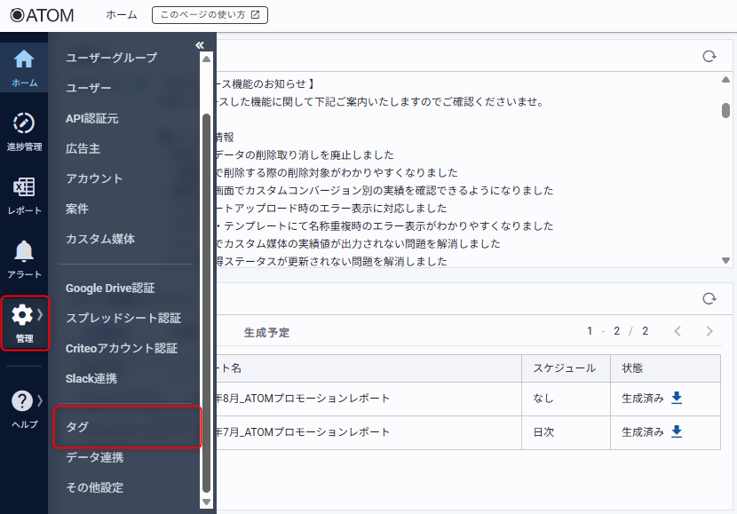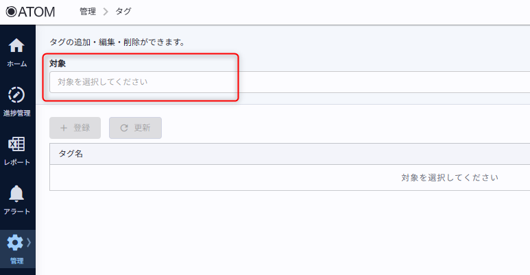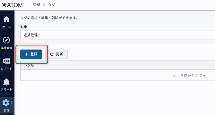 1. ATOMホーム画面内、[管理]から[タグ]をクリックする