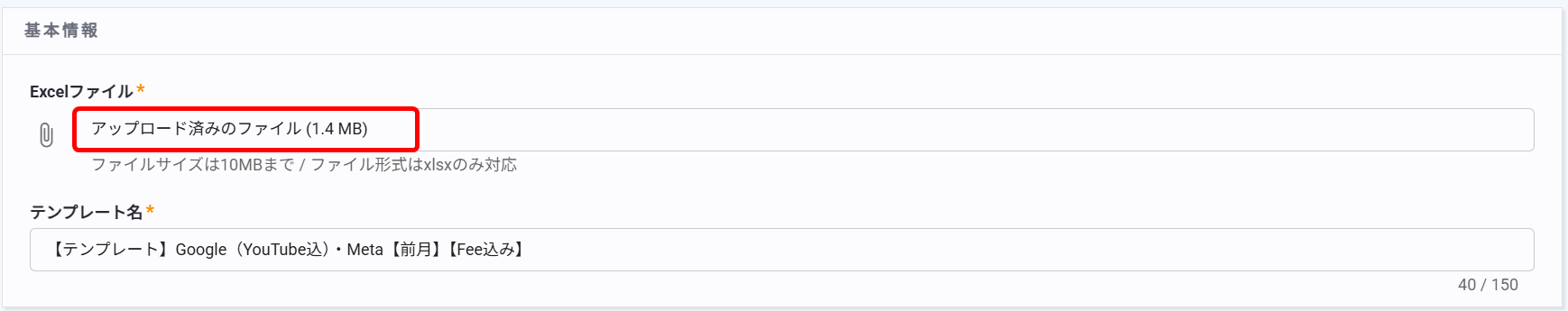 「基本情報」の「アップロード済みのファイル」をクリックして、対象のExcelファイルを選択してください。