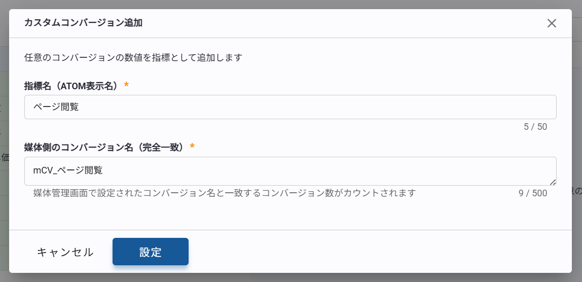 ATOMに表示する指標名、媒体で設定しているコンバージョン名を完全一致で入力して[設定]をクリックします。