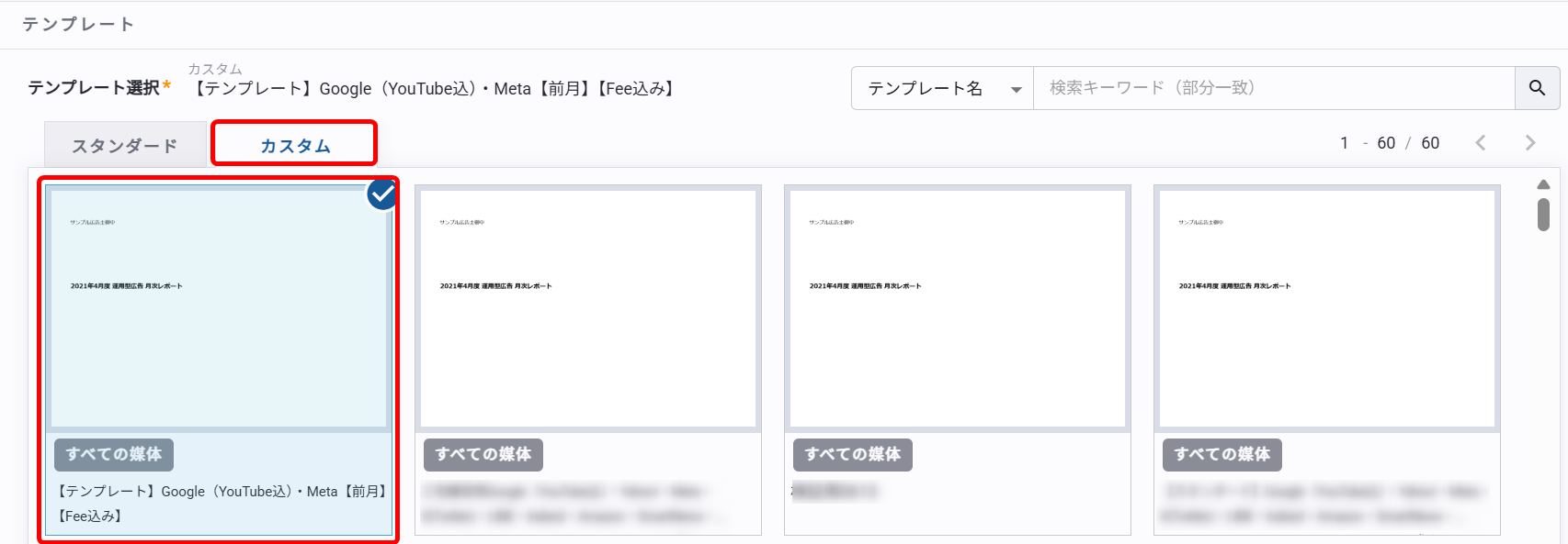 レポート編集画面の「テンプレート選択」で[カスタム]をクリックし、編集したカスタムテンプレートを選択します。