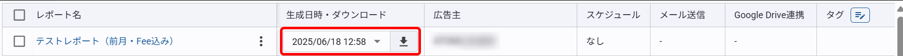 「生成日時・ダウンロード」列にダウンロードボタンが表示されたらレポートの生成が完了しています。