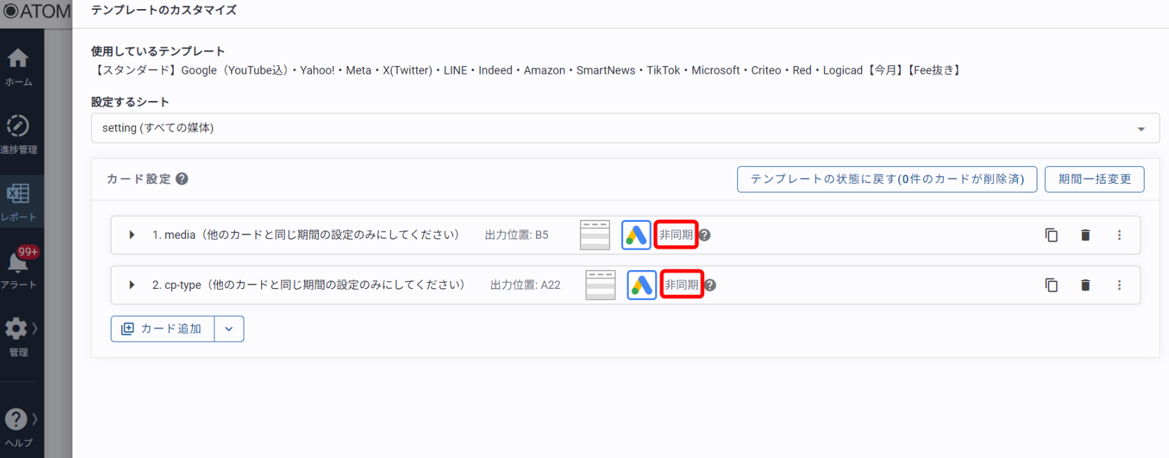 レポートを個別にカスタマイズするとカードが「非同期」の状態になり、テンプレートの変更が反映されなくなります。
