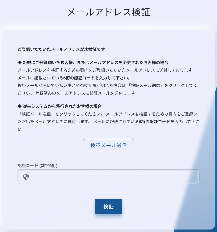 従来版ATOMにログインしているユーザーのメールアドレス宛に認証コードが届きますので、コードを入力してメールアドレスの認証を完了してください。
