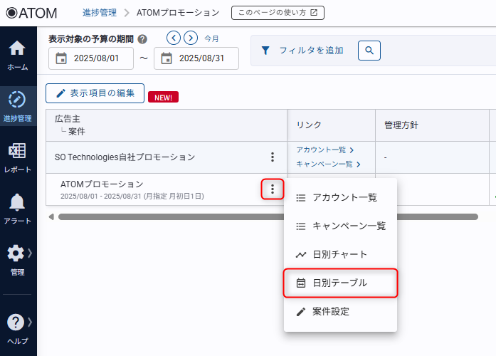 1. コメントを登録したい案件の三点リーダから[日別テーブル]をクリックする