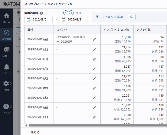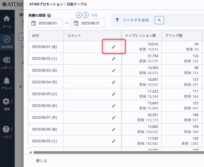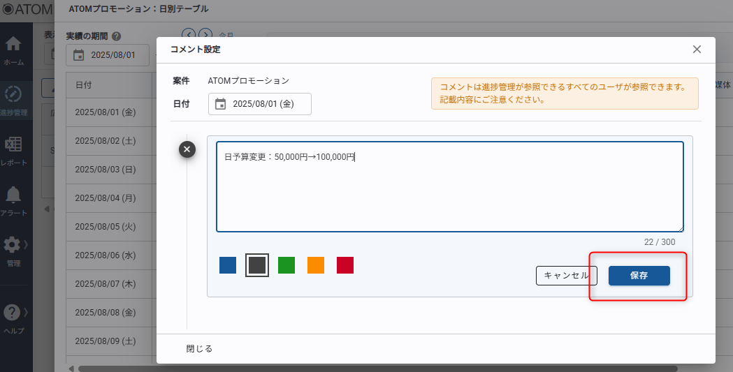 進捗管理では各日にコメントを登録することができます。