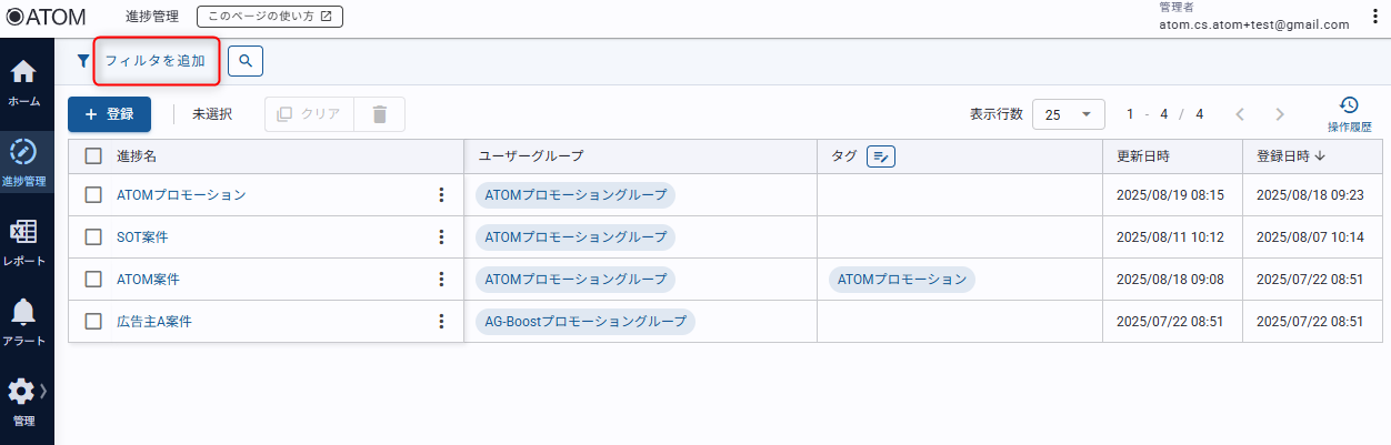 [フィルタを追加]をクリックしてよく利用する進捗管理を表示するフィルタを設定します。