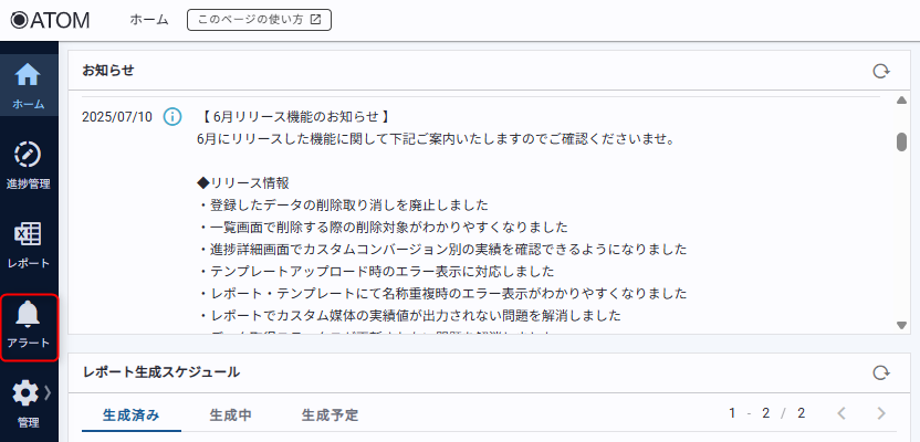 ATOM画面サイドバー[レポート]からレポート一覧画面にアクセスします。