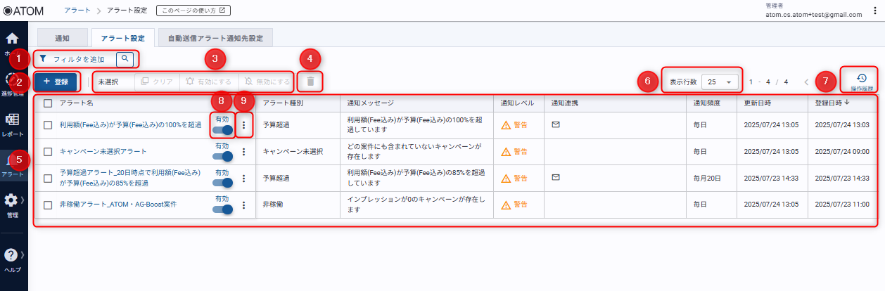 アラート設定の一括編集機能では有効・無効の一括編集が可能です。