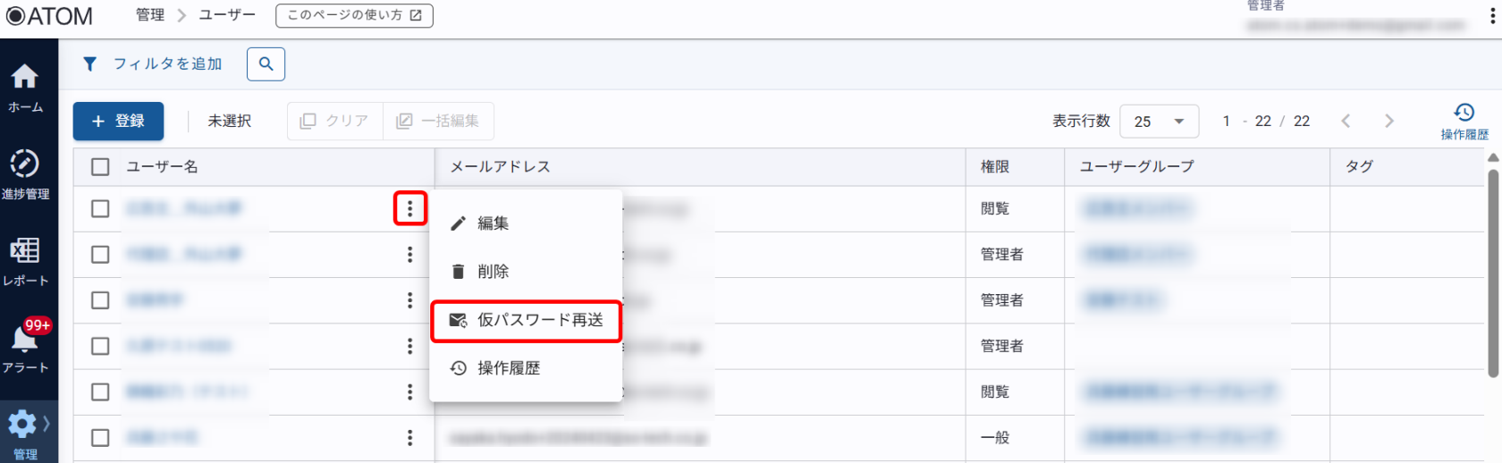 仮パスワードの再送は管理者権限のユーザーのみ対応可能です。