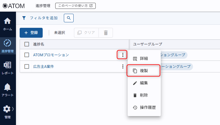 1. 進捗管理一覧画面内、複製したい進捗名の三点リーダから[複製]をクリックする