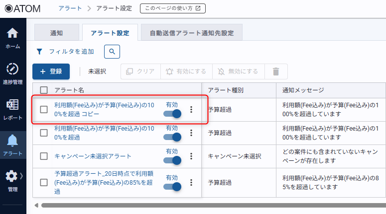 アラートを編集する前に複製機能でバックアップを作成することを推奨します。