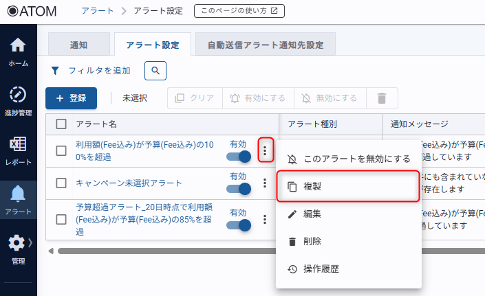 1. アラート設定一覧画面内、複製したいアラート名の三点リーダから[複製]をクリックする