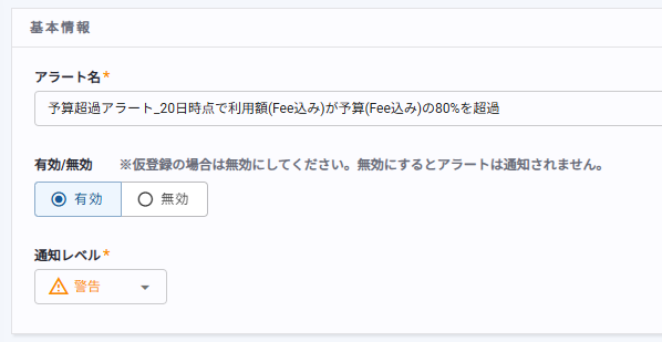 今回は利用額が毎月20日時点で予算の80%を超えたら警告してくれるアラートを設定してみましょう。