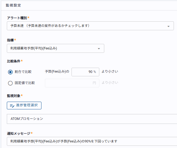 | アラート種別 | アラート種別を選択します。 「予算未達」を選択してください。 |