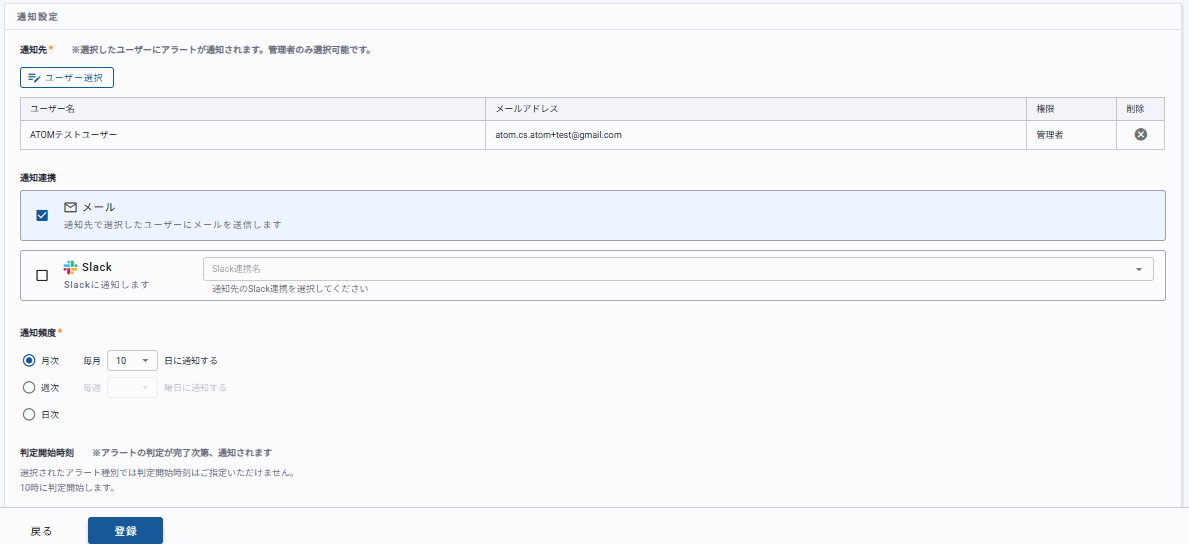 通知先のユーザーへの通知方法を設定します。 メール通知の送信元メールアドレスはno-reply@atom.onlです。 slack連携を設定する場合はあらかじめslack連携を行う必要があります。 |