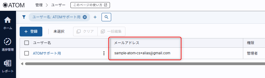 - ATOMのユーザー一覧画面でユーザー「ATOMサポート用」のメールアドレスを確認します。