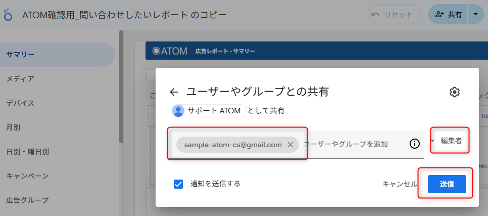 - エイリアス(+と@までの文字列。手順4のキャプチャでは「+alias」部分)を削除したメールアドレスを「ATOM確認用」レポートの編集者として追加し、[送信]をクリックします。