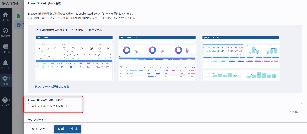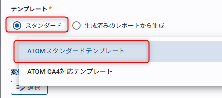 ATOMが用意するLooker Studioテンプレートを利用してレポートを生成する場合は[スタンダード]をクリックして利用するテンプレートを選択してください。