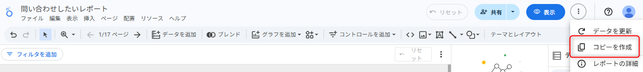 - 対象レポートの三点リーダから[コピーを作成]をクリックします。