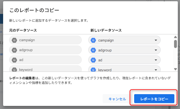 レポートに設定されているBigQueryのデータソースは編集せずに利用してください。