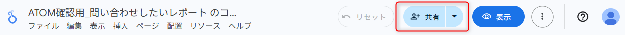 - Looker Studioレポート画面上部の[共有]をクリックします。