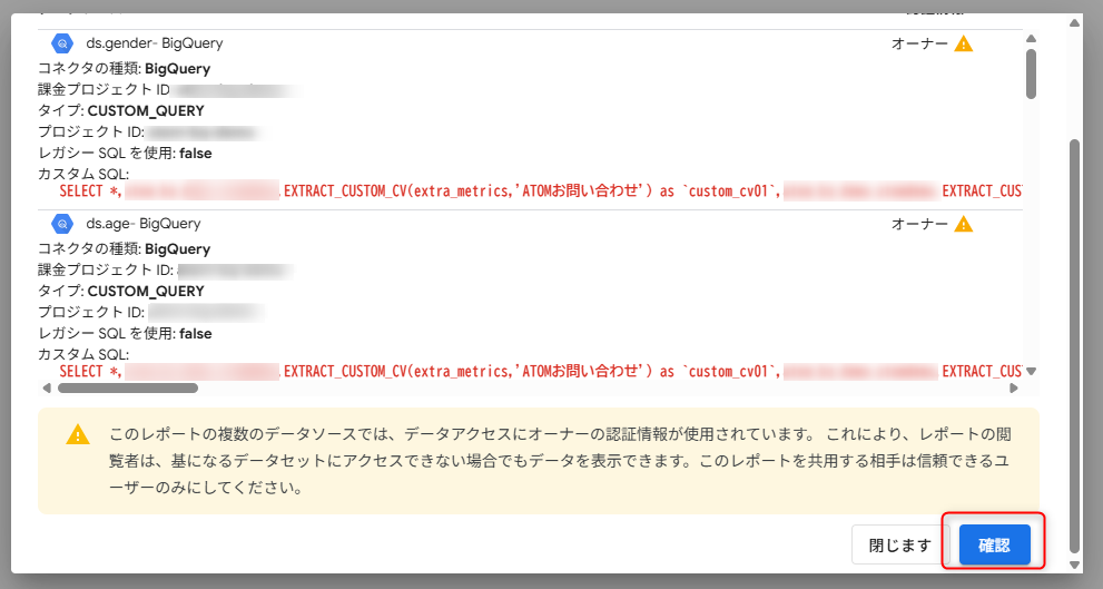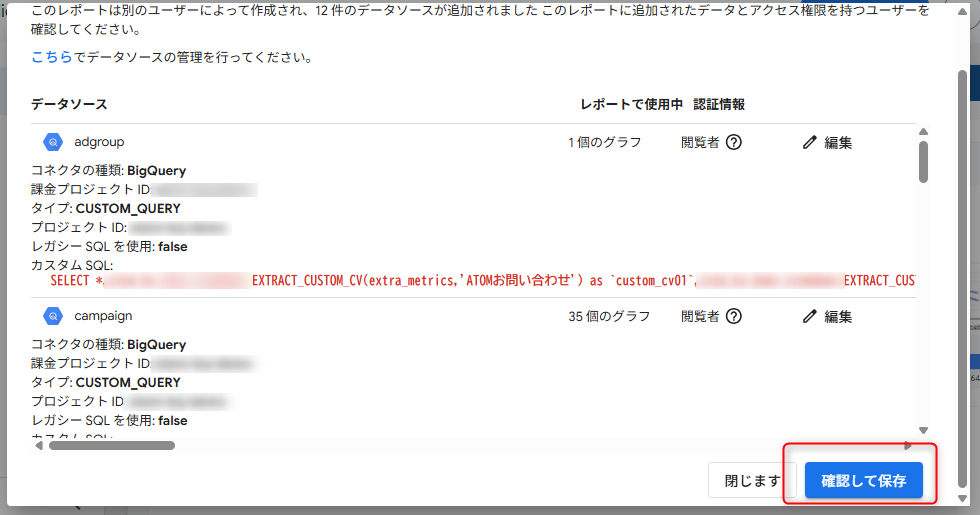BigQueryのデータソースを編集した場合、レポートが正常に表示されない場合があるため、BigQueryのデータソースは編集せずに利用してください。